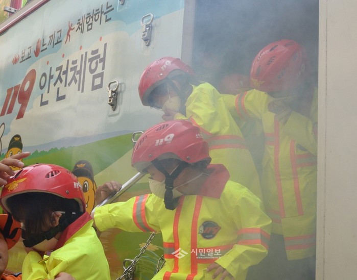 서울 영등포소방서는 지난 21일 오전 도신초등학교 병설유치원에서 원아 100여명을 대상으로 '찾아가는 소방안전체험 교실'을 운영한 가운데 참여 어린이들이 마스크를 쓰고 연기 대피 체험을 하고 있다.(사진제공=영등포소방서)