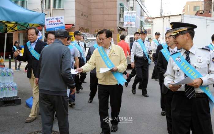 서울 동대문구가 지난 20일 정화여자상업고등학교 인근에서 '학교주변 청소년 유해업소 근절 캠페인'을 펼친 가운데 유덕열 구청장(가운데)이 현진수 동대문소방서장(오른쪽), 참여자들과 함께 유인물을 주민들에게 나눠주고 있다.(사진제공=동대문구청)