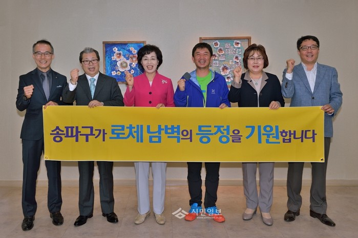 지난 21일 서울 박춘희 송파구청장(왼쪽에서 세 번째)이 구청장실에서 아직까지 정상에 오른 사람이 없는 히말라야 최고난도인 로체 남벽 등정에 오르는 김성대(오른쪽에서 세 번째)씨를 응원하기 위해 플래카드를 들고 파이팅을 외치고 있다.(사진제공=송파구청)