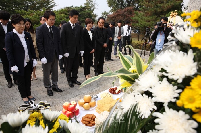 지난 21일 서울 성수대교 붕괴 사고 21주기를 맞아 성수대교 북단 IC 주변 위령탑에서 거행된 희생자 합동 위령제에 참가한 정원오 성동구청장이 헌화를 하고 있다.(사진제공=성동구청)