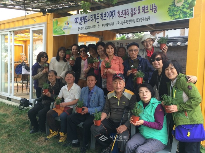 경기 수원시 권선구 서둔동은 지난 21일 여기산 텃밭에서 '허브강좌 및 허브 나눔 행사'를 진행했다. 사진은 행사에 참여한 주민들이 허브를 들고 기념사진을 찍은 모습.(사진제공=권선구청)