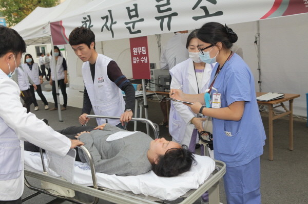 경기 안산시가 최근 2015년 안산시 긴급구조 종합훈련과 연계한 민·관 합동 재난응급의료 대응체계 모의훈련을 실시한 가운데 유관기관 관계자들이 응급환자 발생 상황에 대비한 훈련을 진행하고 있다.(사진제공=안산시청)