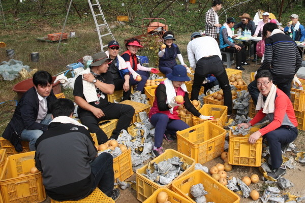 지난 22일 서울 성동구의회 의원들이 경기 양평군 용문면 연수리의 가을걷이로 바쁜 과수원을 방문해 수확한 배를 신문지로 정성스럽게 포장하고 있다.(사진제공=성동구의회)