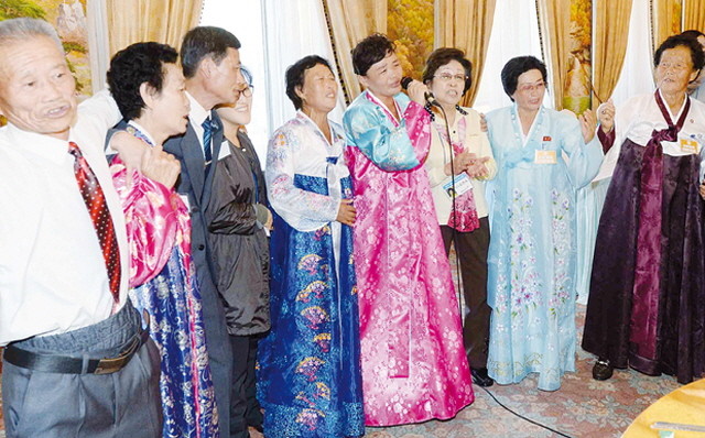 이산가족 상봉행사 2회차 둘째날인 25일 오후 북한 금강산 외금강호텔에서 열린 공동중식에서 남북 가족들이 ‘고향의 봄’, ‘아리랑’, ‘우리의 소원’ 노래를 부르며 즐거운 시간을 보내고 있다.
