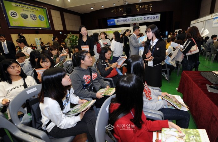 서울 동대문구가 지난 24일 구청 강당에서 '2016학년도 고교진학 정보 박람회'를 개최한 가운데 참여 중학생들이 한 고등학교 학생의 진학정보 설명을 듣고 있다.(사진제공=동대문구청)