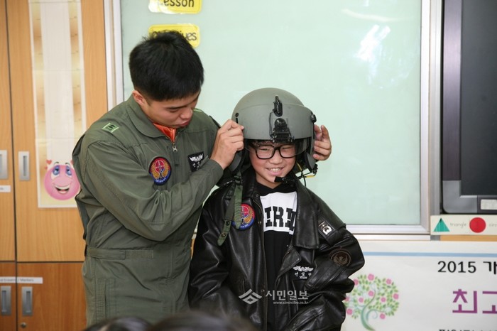경기 하남시 창우초등학교가 최근 배움축제인 '2015 창모루 가을 계절학교'를 개최한 가운데 진로교육 프로그램의 일환으로 파일럿 체험에 참여한 학생들이 항공대 관계자의 도움을 받아 항공모를 착용해 보고 있다.(사진제공=경기도교육청)