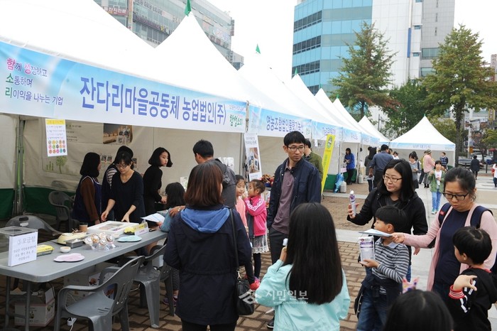 경기 오산시는 지난 24일 오산시청 광장에서 '제2회 오산 사회적경제 함성소리 페스티벌'을 개최한 가운데 우수 마을기업인 잔다리마을공동체에서 만든 제품을 시민들이 체험해 보고 있다.(사진제공=오산시청)
