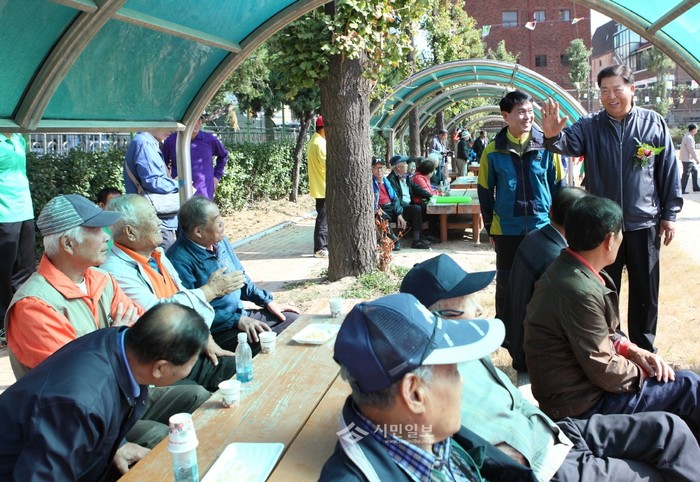 지난 25일 서울 영등포구 대길초등학교에서 신길6동 동민 한마음체육대회가 개최된 가운데 조길형 영등포구청장(오른쪽)이 체육대회를 찾은 주민들에게 인사를 전하고 있다.(사진제공=영등포구청)