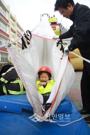 서울 구로소방서는 지난 26일 금천구 소재 서울독산초등학교 운동장에서 독산초등학교 병설유치원 원생 및 교사 등을 대상으로 이동안전체험차량을 활용한 '보고·느끼고·체험하는 119 안전교실' 현장체험학습을 실시해 한 어린이가 12미터 경사구조대를 이용한 지상으로의 탈출체험을 하고 있다.(사진제공=구로소방서)