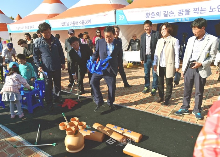 경기 안산시가 최근 호수공원 중앙광장 일원에서 '2015 평생학습★책 문화 한마당'을 개최한 가운데 제종길 안산시장(가운데)이 제기를 차며 전통놀이 체험을 하고 있다.(사진제공=안산시청)