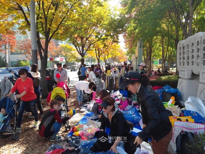 지난 24일 경기 동두천시 송내동 ‘차 없는 거리일원’에서 열린 ‘2015 송내 돗자리 토요장터 물물’을 방문한 주민들이 돗자리에 진열돼 있는 물건을 살펴보고 있다.(사진제공=동두천시청)