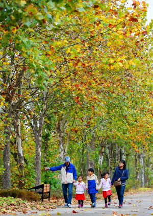 가을의 쌀쌀한 날씨가 계속되고 있는 가운데 지난 26일 오후 경기 안산시의 한 산책길에 형형색색으로 물든 나무가 지나가는 시민들의 눈길을 끌고 있다./뉴시스