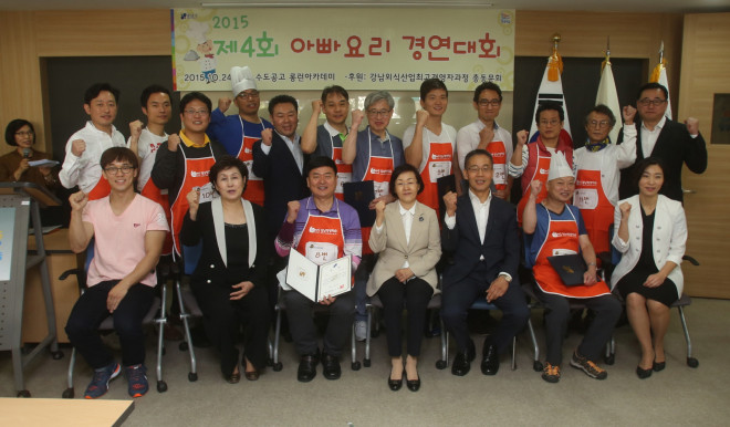 신연희 강남구청장(앞열 오른쪽에서 4번째)이 지난 24일 오후 1시 서울 강남구 수도공업고등학교에서 열린 ‘제4회 아빠요리경연대회’에 참석해 참여자들과 함께 기념촬영하고 있다.