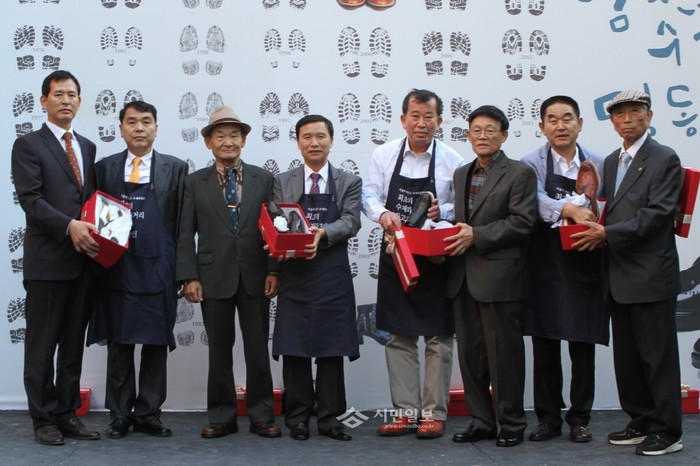 서울 중구는 지난 24일 명동에서 '건강한 발 건강한 구두로 다시 태어나는 염천교 수제화거리' 사업의 일환으로 '서울역-염천교 백(100) 구두 파티'를 진행했다. 사진은 백구두 증정식에 참석한 관계자들의 모습.(사진제공=중구청)