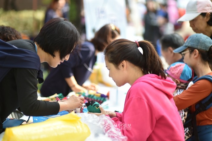 중랑구는 최근 용마폭포공원에서 주민 1000여명이 참여한 가운데 '2015. 마을박람회 및 제3회 마을로의 초대'를 개최했다. 사진은 행사에 참가한 주민들이 바느질 체험을 하는 모습.(사진제공=중랑구청)