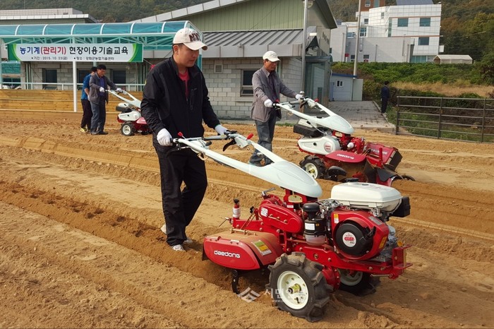 인천 강화군이 최근 농산업기계교육장에서 농업인이 자주 사용하는 관리기의 올바른 사용을 알리고자 '운전 실습 교육'을 실시한 가운데 참여 농업인들이 관리기를 직접 운전해보며 교육받고 있다.(사진제공=강화군청)