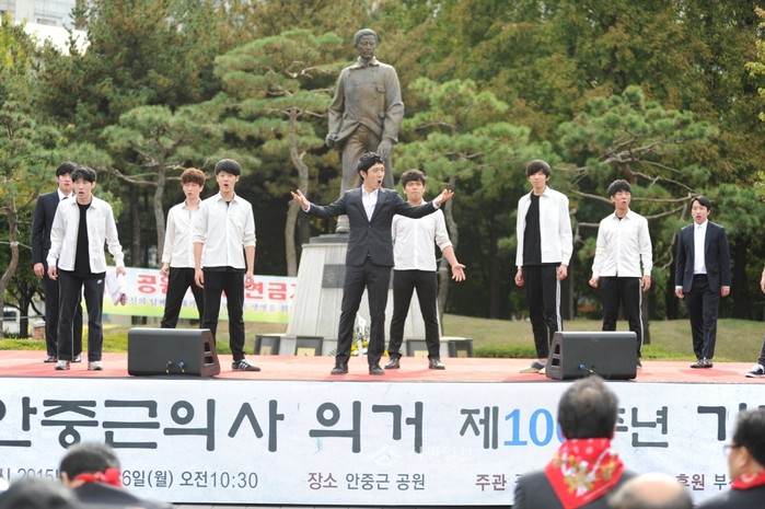경기 부천시는 지난 26일 안중근공원에서 '안중근 의사 의거 106주기 기념식 행사'를 개최한 가운데 부천 오페라단과 경기예술고 학생들이 안 의사의 의거를 형상화한 뮤지컬 <영웅>의 하이라이트 공연을 펼치고 있다.(사진제공=부천시청)