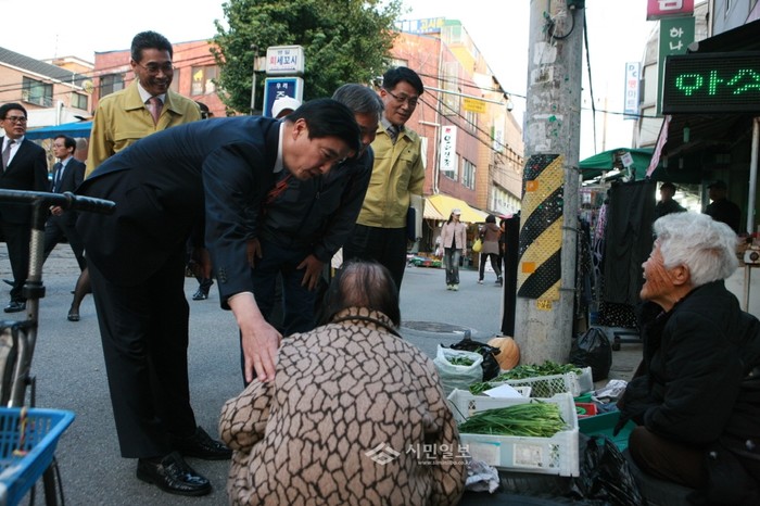 지난 28일 서울 강동구 명일1동에서 진행된 ‘동동 현장데이트’에 참석한 이해식 강동구청장(왼쪽)이 주민 간담회를 마친 후 거리에 나와 행상에서 장사를 하고 있는 노인들과 이야기를 나누고 있다.(사진제공=강동구청)