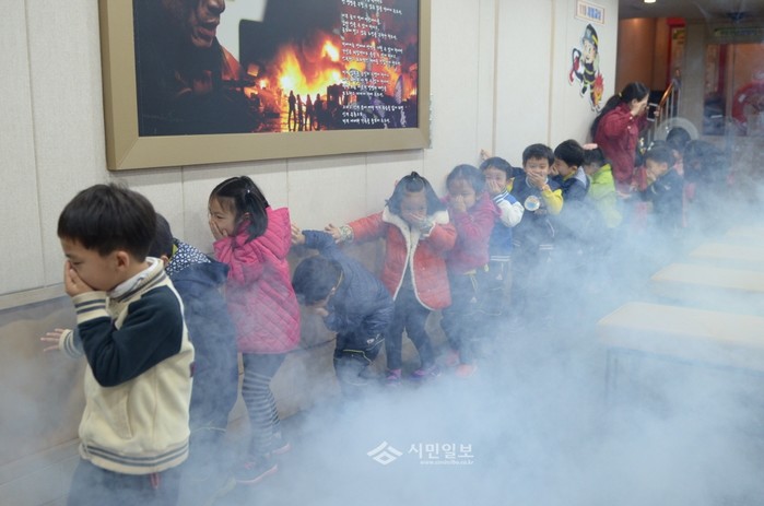 서울 영등포소방서는 지난 28일 오전 소방서 4층 안전체험교육관에서 양평3가어린이집 보육교사 및 원아들을 대상으로 소방안전 체험을 실시한 가운데 어린이들이 연기대피 체험을 하고 있다.(사진제공=영등포소방서)
