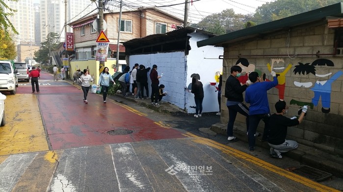 경기 양주시 회천1동 주민자치위원회는 최근 덕정초등학교 후문 일대에서 주민자치 특색사업인 '회천1동 아름다운 벽화마을 만들기'를 실시했다. 사진은 행사에 참석한 학생들이 벽화를 그리는 모습.(사진제공=양주시청)