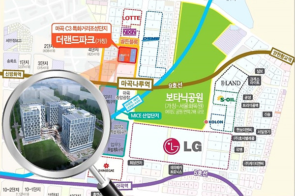 마곡지구의 핵심지역인 9호선 마곡나루역 업무C3-1, C3-2, C3-3블록에 들어서는 두산중공업의 ‘마곡 두산 더랜드파크’ 오피스와 상가는 마곡나루역 역세권 오피스 가운데 가장 규모가 크다.
