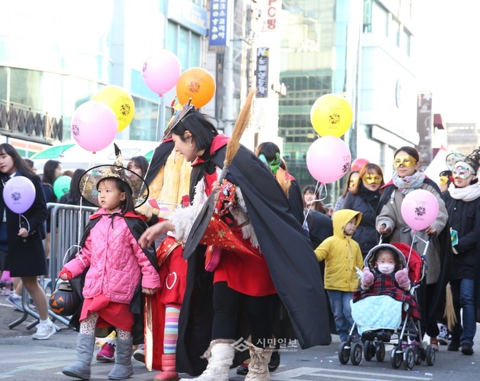 최근 마포구 일대에서 '제1회 마포공연예술관광 페스티벌'의 일환으로 진행된 '할로윈 거리예술 퍼레이드'가 개최된 가운데 시민들이 퍼레이드에 참여해 행진을 펼치고 있다. 이번 페스티벌은 4일까지 열린다. (사진제공=마포구청)