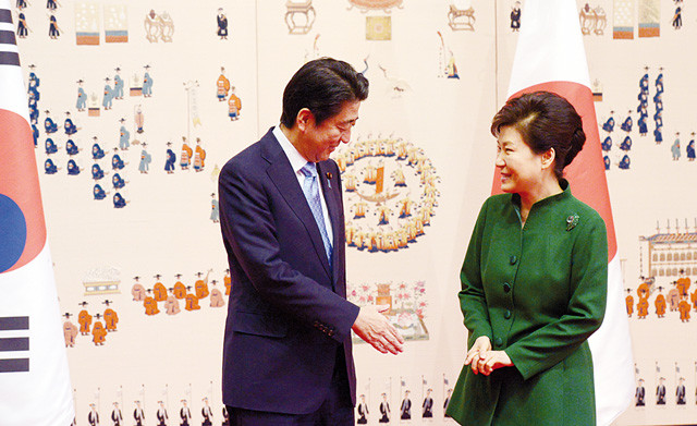 아베 신조 일본 총리가 2일 오전 청와대에서 박근혜 대통령과 정상회담 전 기념촬영 전 악수를 청하고 있다.