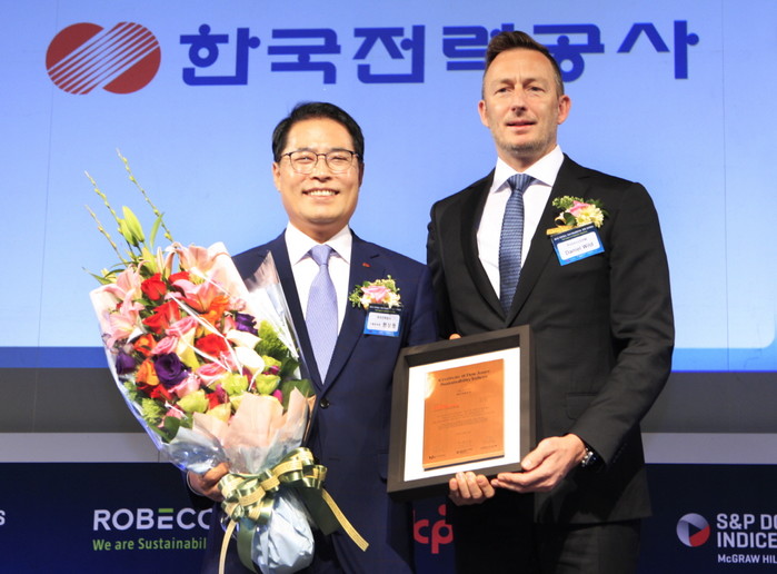 | ▲ 지난 10월28일 서울 그랜드 하얏트 호텔에서 열린 ‘2015 다우존스 지속가능경영지수(DJSI) 인증식’에서 한국전력 현상권 기획본부장(왼쪽), 로베코샘(RobecoSAM) 다니엘 와일드(Daniel Wild) 사장(오른쪽)이 기념 촬영을 하고 있다. | ||