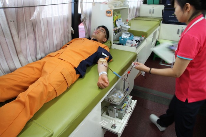 서울 동작소방서 소방관들은 최근 소방서를 방문한 대한적십자사 헌혈버스에서 헌혈을 진행했다. 사진은 한 소방관이 헌혈을 하고 있는 모습.(사진제공=동작소방서)