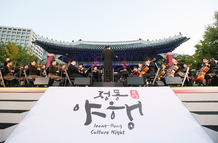 중구는 최근 한국근대문화유산의 집결지인 정동에서 '가을 정동야행(夜行)축제'를 개최했다. 사진은 덕수궁 중화전 앞에서 서울팝스오케스트라와 예원학교 학생들의 합동공연이 진행되는 모습.(사진제공=중구청)