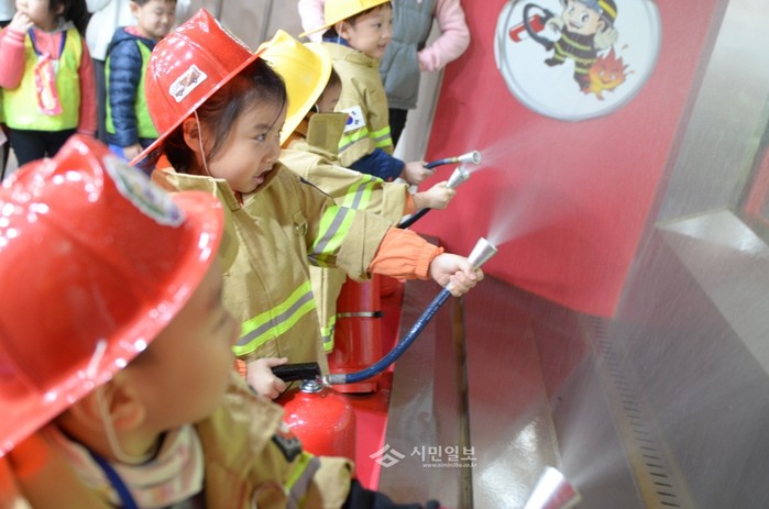 서울 영등포소방서는 지난 2일 소방서 4층 소방안전체험관에서 신길동 소재 하정어린이집 보육교사와 어린이 50여명을 대상으로 소방안전체험교육을 실시했다. 사진은 어린이들이 소화기 사용법을 실습하는 모습.(사진제공=영등포소방서)