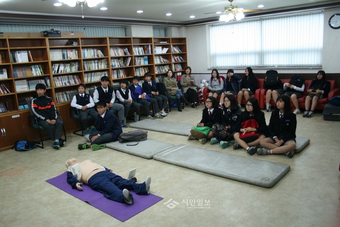 경기 여주소방서는 지난 3일 응급처치교육장에서 점동중학교 학생 20여명을 대상으로 '2015년 중학교 자유학기제 미래소방관 직업체험교실'을 실시했다. 사진은 학생들이 응급처치 교육 프로그램을 시청하는 모습.(사진제공=여주소방서)
