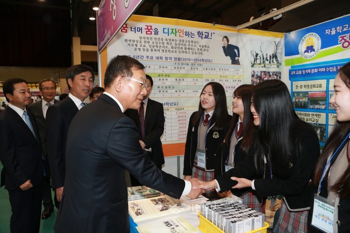 전남장흥교육지원청은 5일까지 장흥실내체육관에서 '2015 장흥 DoDream 커리어잡 페스티벌'을 개최한다. 사진은 지난 3일 페스티벌에 참석한 장만채 전남도 교육감이 학생들과 반갑게 악수하는 모습.(사진제공=장흥교육지원청)