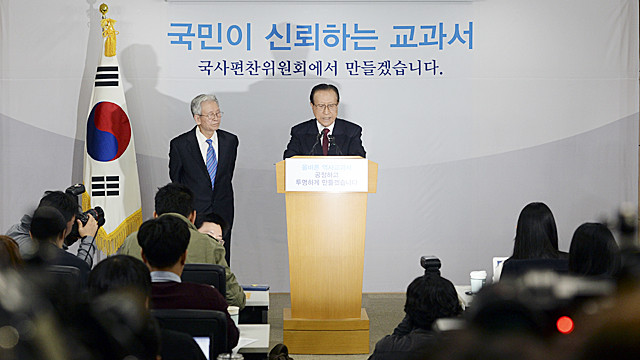 4일 오전 종로구 정부서울청사 합동브리핑실에서 김정배 국사편찬위원회 위원장이 올바른 역사교과서 집필기준과 집필진 구성에 관련한 브리핑을 하고 있다. 왼쪽은 집필진에 참여하는 신형식 이화여대 명예교수.