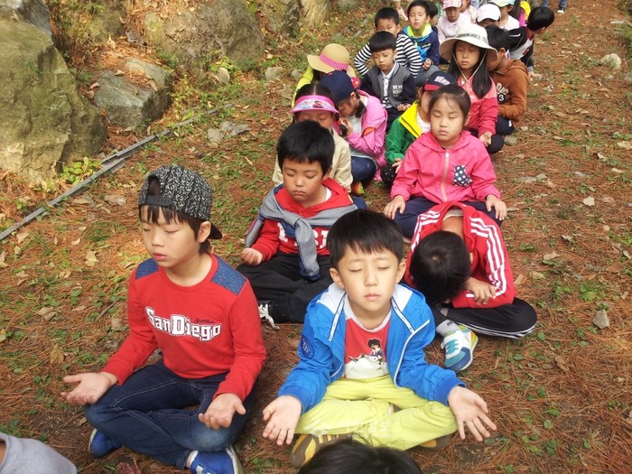 경기 가평초등학교 1학년 학생들은 최근 '연인산 숲 체험학습'을 실시했다. 사진은 체험학습에 참가한 학생들이 연인산 길에 앉아서 명상을 하고 있는 모습.(사진제공=가평초등학교)