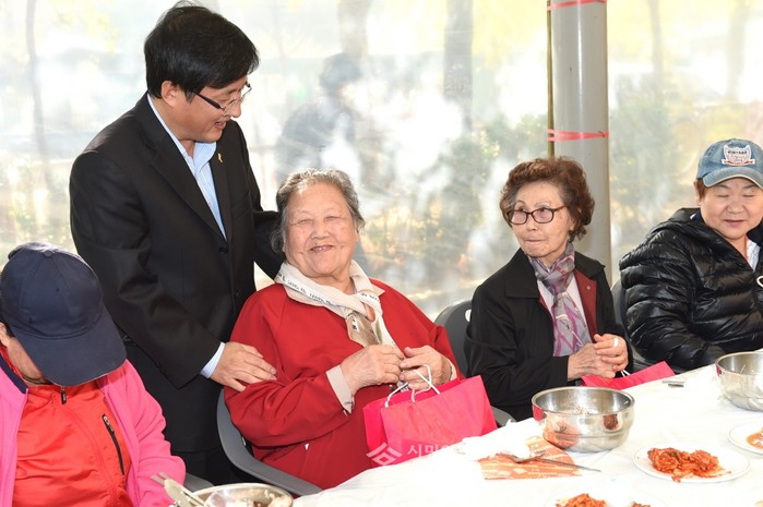 김성환 서울 노원구청장이 지난 4일 오전 11시 하계2동 주민센터 옆 게이트볼장에서 열린 ‘행복한 노풍당당 경로잔치’에 참석해 노인들과 인사를 나누고 있다.(사진제공=노원구청)