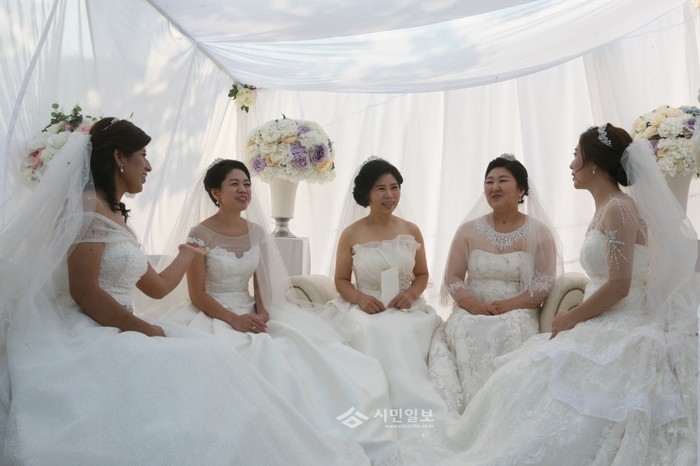 강동구는 지난 4일 오후 2시 일자산 자연공원 잔디마당에서 다문화부부 5쌍의 무료 합동결혼식을 개최했다. 사진은 이번에 결혼하는 다문화부부 신부대기실에서 신부들이 이야기를 나누는 모습.(사진제공=강동구청)