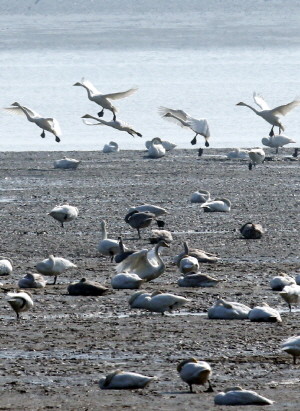 입동(立冬)을 사흘 앞둔 5일 탐진강 하구인 전남 강진군 칠량면 일대 강진만에 천연기념물 제 201호 큰고니 1000여마리가 찾아와 월동을 나고 있다./뉴시스