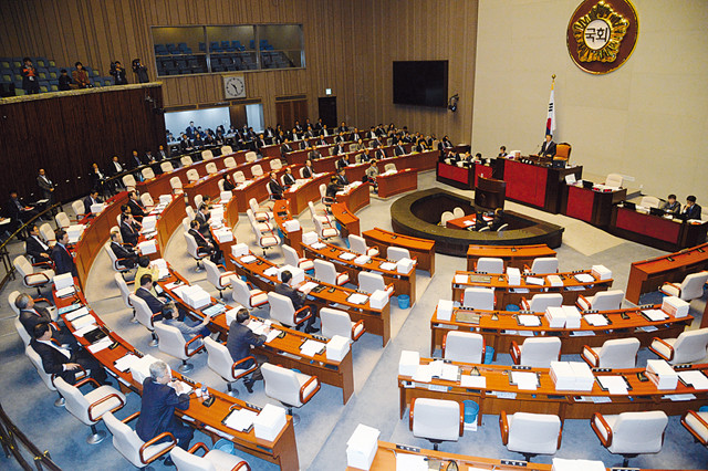 5일 오전 서울 여의도 국회에서 열린 예산결산특별위원회 부별정책질의에서 새정치민주연합 의원들이 의사진행발언을 한 뒤 퇴장해 야당의 의석(오른쪽)이 모두 비어있다. 이날 예결위는 여당 단독으로 진행됐다.