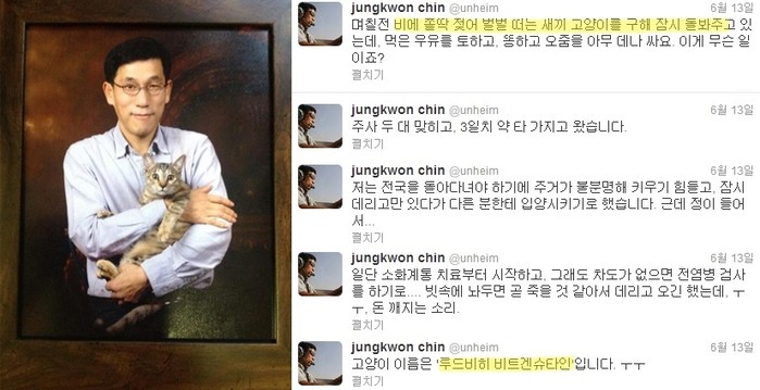 당시 진중권은 "(상태가 안좋은 고양이에게) 주사 두 대를 맞히고, 3일치 약 타 가지고 왔습니다"라며 "다른 분한테 입양시키기로 했습니다. 근데 정이 들어서..."라고 고양이에 대한 애정이 생겼음을 밝혔다.