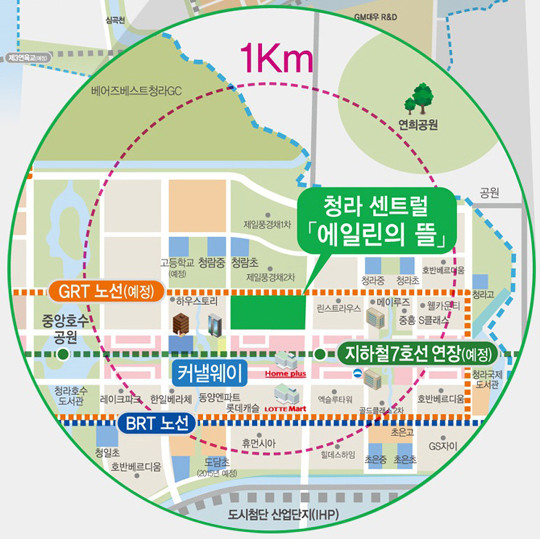 청라국제도시 M1블럭에 들어서는 아이에스동서의 ‘청라 센트럴 에일린의뜰’은 수변상업시설과 문화시설이 풍부한 커낼웨이 중심에 위치하고 있으며, 지하 2층~지상 37층, 10개동(아파트 6개동, 오피스텔 4개동) 규모로 아파트는 전용면적 84~95㎡의 아파트 1,163세대, 45~55㎡의 오피스텔 866실로 총 2,029세대의 초대형 단지로 구성되는 주거복합단지다.