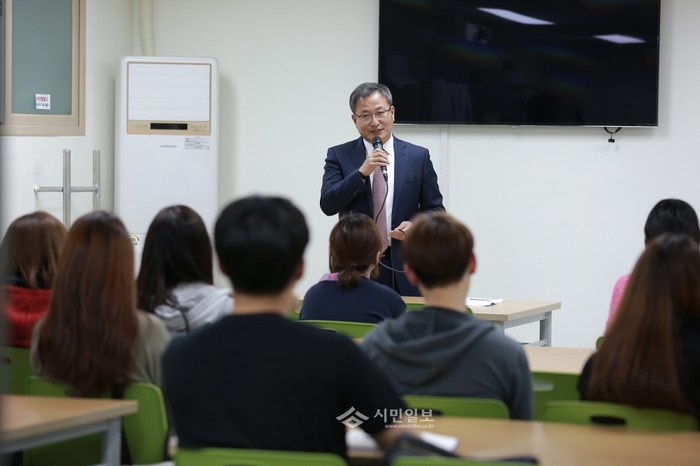 경기 포천시는 지난 5일 서울 강북구에 있는 포천학사에서 제2회 선배톡톡(talk! talk!)' 특강을 개최했다. 사진은 이날 강사로 나선 (주)필인터내셔널 박치범 대표이사가 강의를 진행하는 모습.(사진제공=포천시청