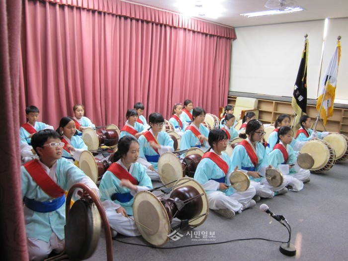 경기 부천시 성주초등학교는 최근 교내에서 '2015학년도 성주초 학예 발표회'를 진행했다. 사진은 학예 발표회 식전행사로 학교 사물놀이부 학생들이 장구, 꽹가리등을 치며 사물놀이 공연을 진행하는 모습.(사진제공=부천교육지원청)