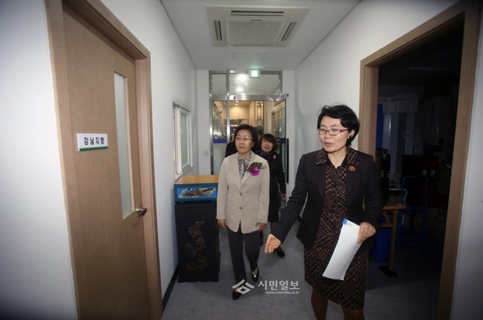 서울 강남구는 최근 대치 유수지 체육공원에서 '강남지역자활센터 이전 개소식'을 개최했다. 사진은 개소식에 참석한 신연희 강남구청장(왼쪽)이 자활센터 내부를 둘러보고 있는 모습.(사진제공=강남구청)