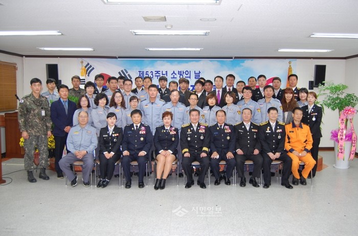 경기 오산소방서는 9일 오전 10시30분 본서 3층 대회의실에서 소방공무원, 의용소방대원 등 150여명이 참석한 가운데 '제53주년 소방의 날' 기념식을 개최했다. 사진은 기념식에 참석한 관계자들이 기념촬영한 모습.(사진제공=오산소방서)