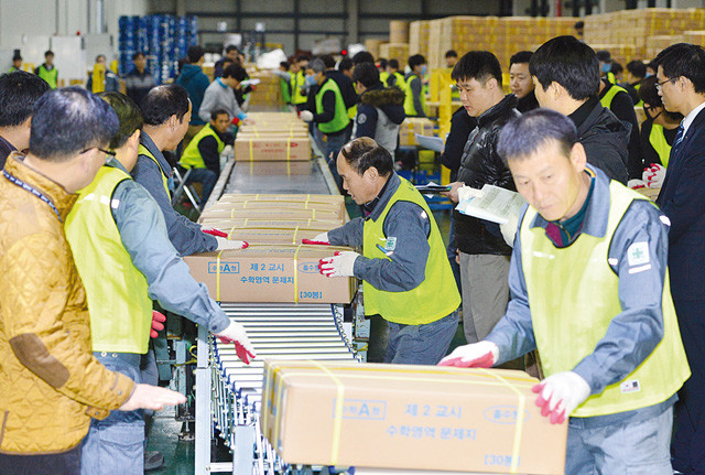 2016학년도 대입수학능력시험일을 사흘 앞둔 9일 오전 세종시 한 인쇄공장에서 관계자들이 수능 문제지와 답안지를 전국 시험 지구별로 배부하고 있다.