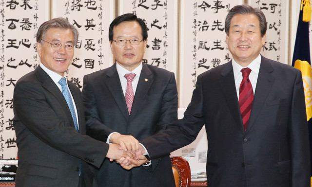 9일 오후 서울 여의도 국회 의장실에서 정의화 국회의장, 새누리당 김무성 대표, 새정치민주연합 문재인 대표가 회동, 손을 잡고 있다.