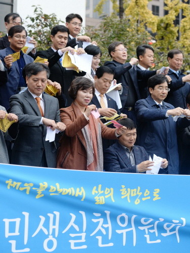 서울시의회 새정치민주연합 민생실천위원회가 제264회 정례회 개회를 앞둔 9일 오전 서울 중구 세종대로 서울시의회 앞에서 '민생 속으로! 현장 속으로!'를 슬로건으로 민생투어에 나서기에 앞서 부실채권 소각 퍼포먼스를 하고 있다. 이 자리에는 서울시의회 박래학 의장, 새정치민주연합 신원철 대표의원, 박양숙 민생실천위원장, 주빌리은행 유종일 공동은행장, 제윤경 이사 등이 참석했다.
