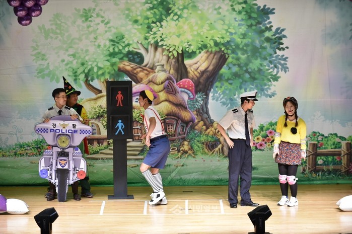 서울 중랑구는 최근 구청 지하대강당에서 지역내 어린이 2000명이 참여한 가운데 어린이 교통안전 뮤지컬 '짜잔경찰' 공연을 진행했다. 사진은 뮤지컬 공연이 진행 중인 모습.(사진제공=중랑구청)