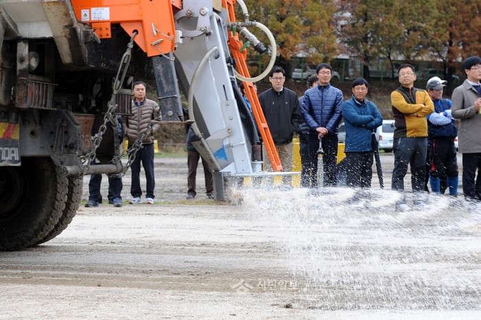 지난 9일 송파구 탄천빗물펌프장에서 올겨울 폭설에 대비한 '제설장비가동훈련'이 진행됐다. 사진은 송파구 제설담당 공무원들이 장비시연을 하고 있는 모습.(사진제공=송파구청)